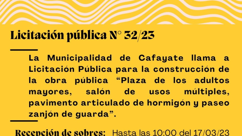 La Municipalidad de Cafayate lanza la licitación pública, enmarcada en la Resolución N° 32/23, para la construcción de la obra pública “Plaza de los adultos mayores, salón de usos múltiples, pavimento articulado de hormigón y paseo zanjón de guarda”.