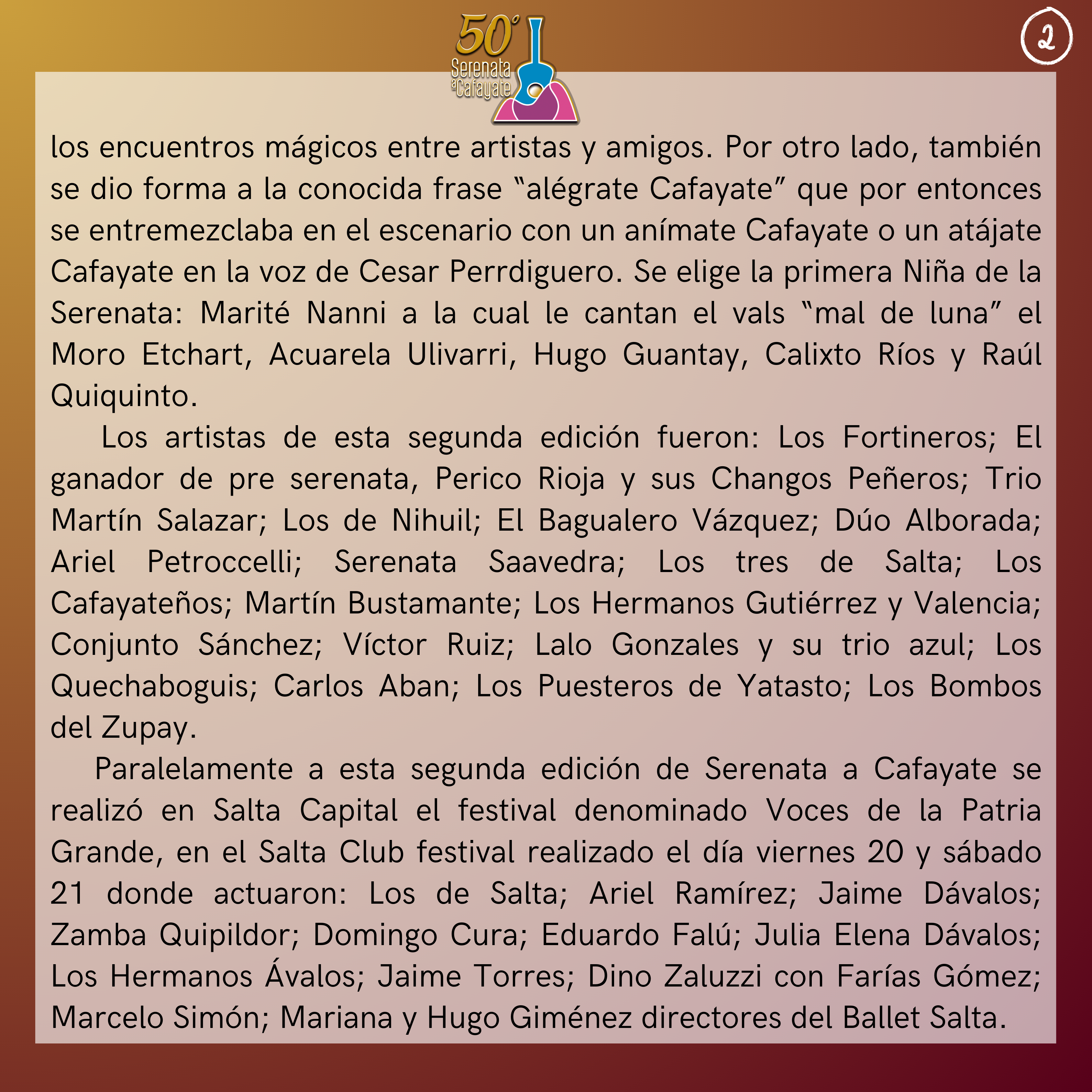 La Serenata a Cafayate tuvo su primera edición en el año 1974 y es reconocida como un suceso trascendente en el plano cultural y musical. Con la Serenata a Cafayate Salta se incorpora al corredor nacional de festivales folclóricos nacionales permitiendo de esta manera una amplia promoción turística de Cafayate y el Valle Calchaquí mostrando una notoria visibilidad de este territorio e incorporándose al circuito turístico argentino.