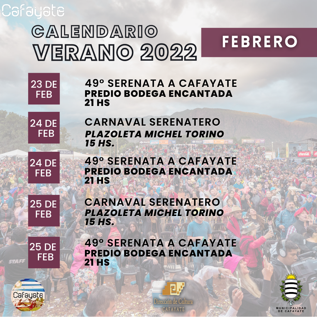 La Secretaría de Turismo y la Dirección de Cultura dieron a conocer el Calendario de actividades que tendrán lugar durante los meses de diciembre, enero, febrero y marzo en Cafayate.